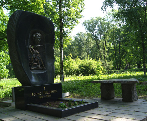 Открытие надгробного памятника композитору Б.И. Тищенко на Литераторских Мостках (Волковское кладбище) в Санкт-Петербурге. Автор - Дмитрий Каминкер, шрифт - Юрий Александров, каменотёсные работы - мастерская Андрея Руднева; 2012-2013, габбро-диабаз, гранит, бронза.